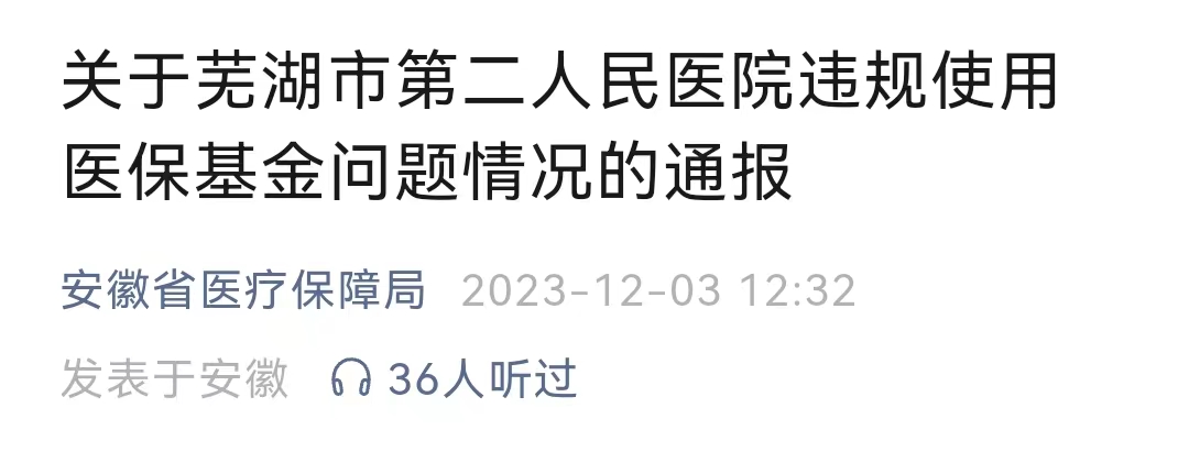 2023年7月18日,我局接到杨某某信访举报件,反映芜湖市第二人民医院在其父因脑出血住院期间通过虚构、串换诊疗服务等方式违法违规使用医保基金。我局高度重视,在做好数据筛查分析基础上,于8月8日与芜湖市医保局组成20余人的省市联合检查组进驻该院,对举报人父亲住院期间医院收费和医保报销情况进行全面核查。通过病历核查、现场询问及数据比对等方式,核查出举报涉及的15个问题中有10个问题基本属实。经查,该院存在过度诊疗、过度检查、超量开药、重复收费、套用收费、超标准收费等问题,涉及违规医疗总费用21.82万元,其中违规使用医保基金18.70万元。为维护医保基金安全,保护患者合法权益,根据该院与芜湖市医保部门签订的定点医疗机构医保服务协议,芜湖市医保局先行按协议进行了处理:一是全额追回违规使用的医保基金,并按30%顶格扣罚违约金56074.41元;二是约谈医院有关负责人,责令其立即整改;三是分别移交公安、卫健部门进一步核查处理。目前,以上各项处理措施均已完成。同时,芜湖市医保局已按照《医疗保障基金使用监督管理条例》,启动行政处罚程序。在对举报问题开展核查的同时,省市联合检查组举一反三,对该院2022年4月1日—2023年5月31日医保基金使用情况进行了全面延伸检查,目前正在进一步核实,后续将按程序依法依规严肃处理。9月25日,芜湖市医保局依据《安徽省医疗保障基金监督管理举报线索处理实施细则(试行)》,将核查和处理情况以监管告知书形式书面反馈给举报人。按照《安徽省违法违规使用医疗保障基金举报奖励办法》,给予举报人5364.04元举报奖励。我们欢迎社会各界对定点医药机构医保基金使用情况进行监督,对于查实的问题,我们将严肃处理,绝不姑息。